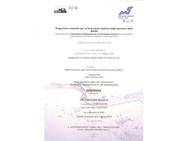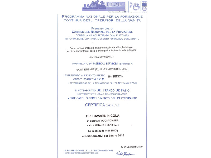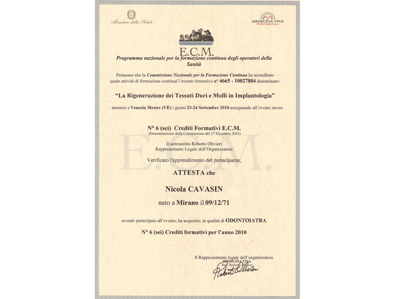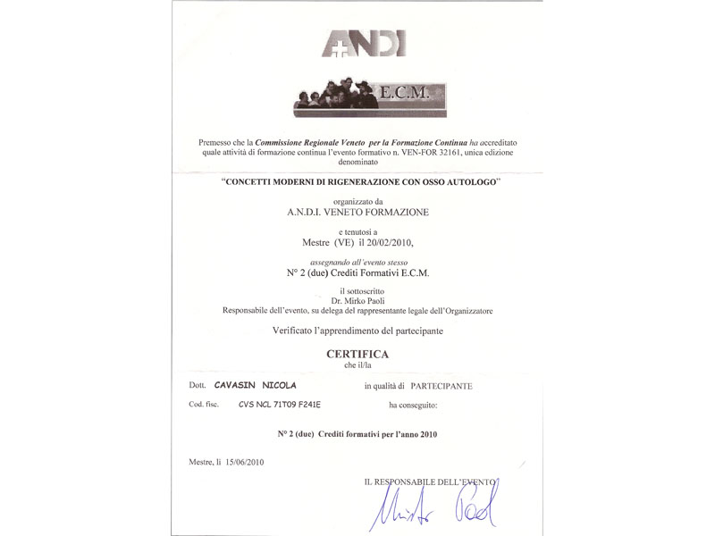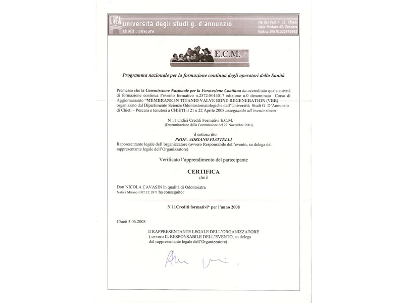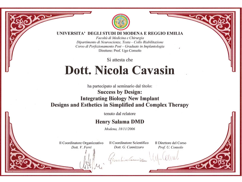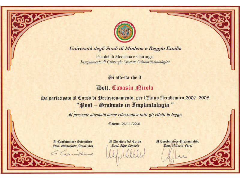 - Master nel 2008 e 2010 in Implantologia Post-Graduate all’Università di Modena