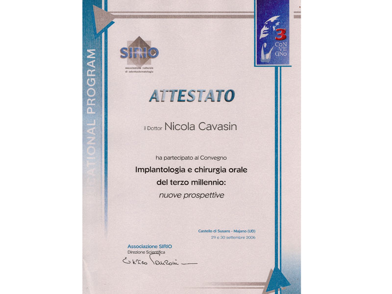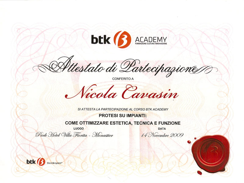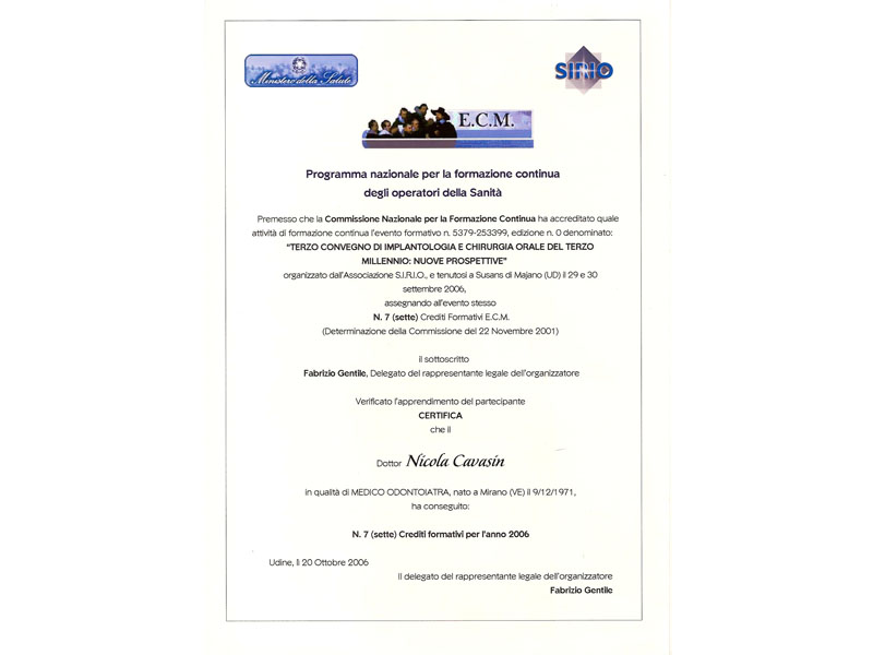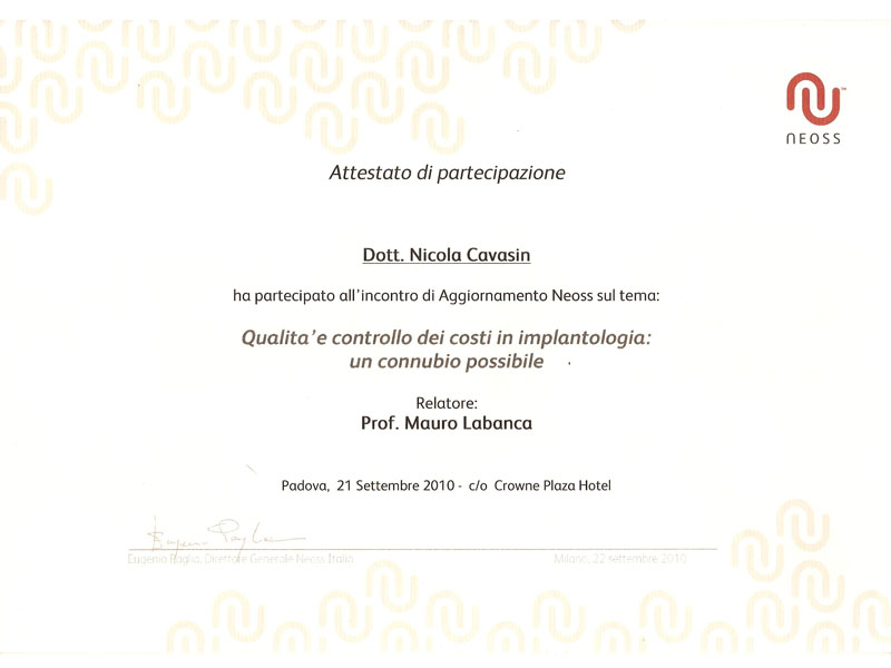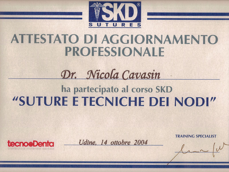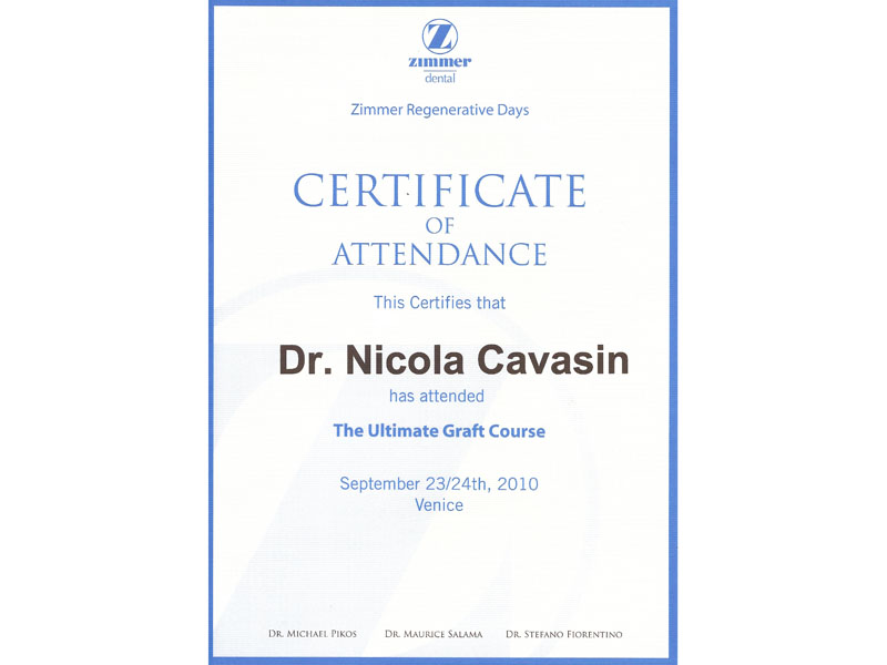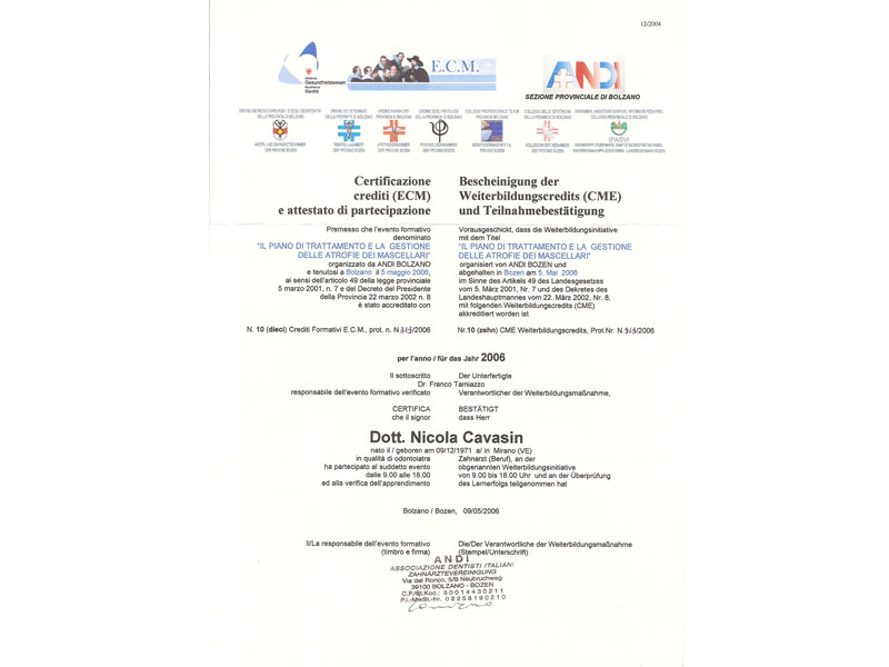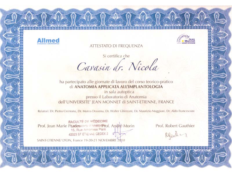 - Master nel 2008 e 2010 in Implantologia Post-Graduate all’Università di Modena