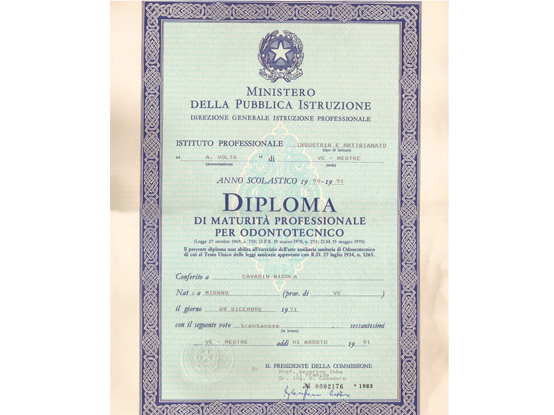 - Diploma di odontotecnico nel 1992, titolare di laboratorio odontotecnico dal 1996 al 2005.