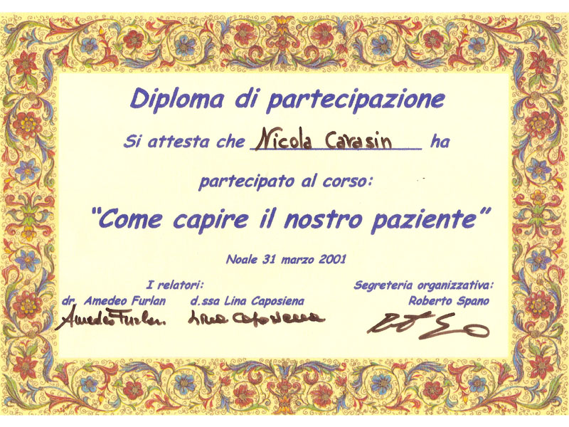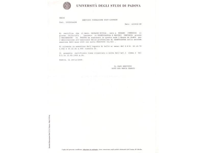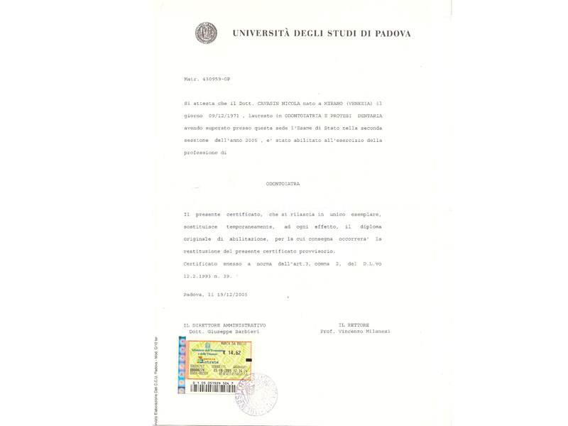 - Laurea in odontoiatria e protesi dentaria presso l’università degli studi di Padova il 20/12/2005